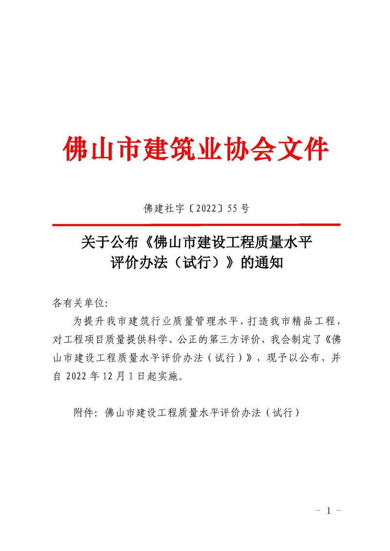 關(guān)于公布《佛山市建設(shè)工程質(zhì)量水平評價(jià)辦法(試行)》的通知(佛建社字〔2022〕55號)