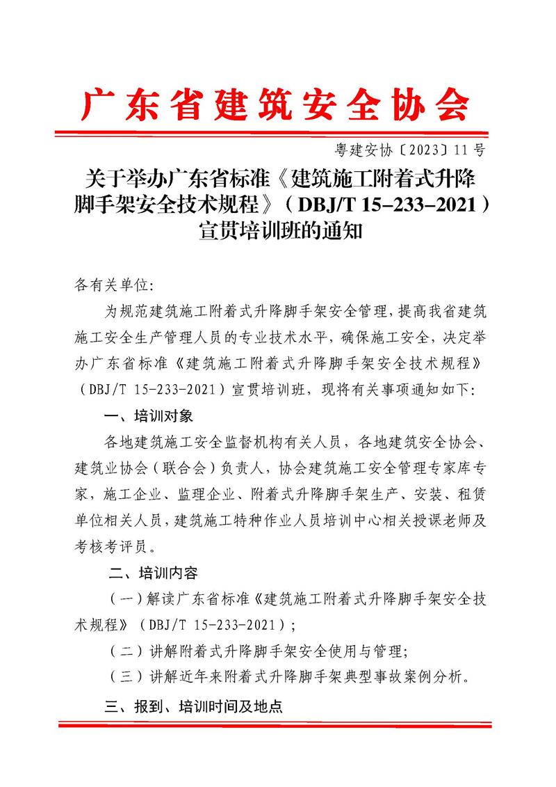 轉(zhuǎn)發(fā)關于舉辦廣東省標準《建筑施工附著式升降腳手架安全技術規(guī)程》(DBJT 15-233-2021)宣貫培訓班的通知(2023/03/03)