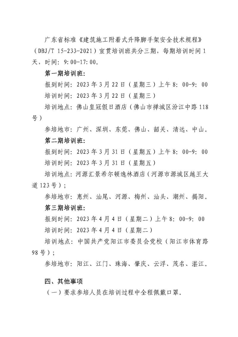 轉發(fā)關于舉辦廣東省標準《建筑施工附著式升降腳手架安全技術規(guī)程》(DBJT 15-233-2021)宣貫培訓班的通知(2023/03/03)