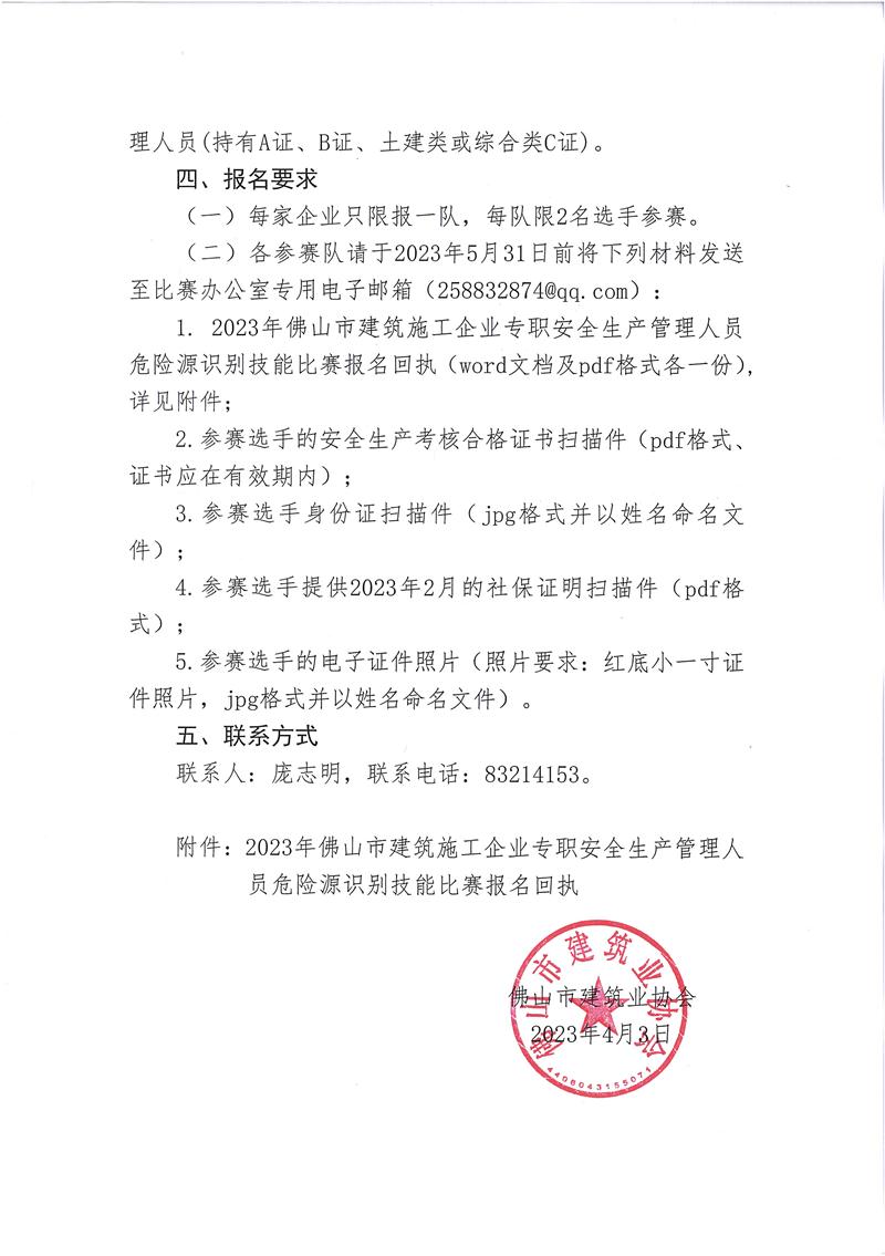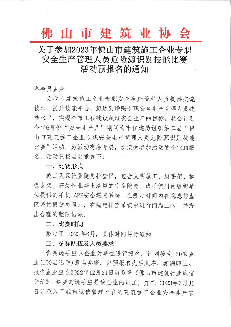 關(guān)于參加2023年佛山市建筑施工企業(yè)專職安全生產(chǎn)管理人員危險(xiǎn)源識(shí)別技能比賽活動(dòng)預(yù)報(bào)名的通知(2023/04/03)