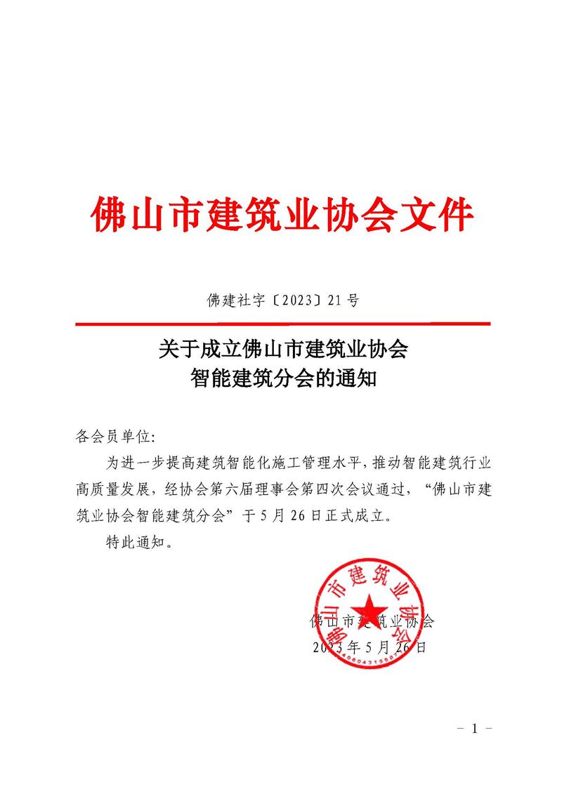 關于成立佛山市建筑業(yè)協(xié)會智能建筑分會的通知(佛建社字〔2023〕21號)