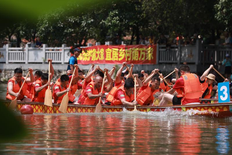參賽隊(duì)員在龍舟上盡情揮槳,奮楫爭(zhēng)先