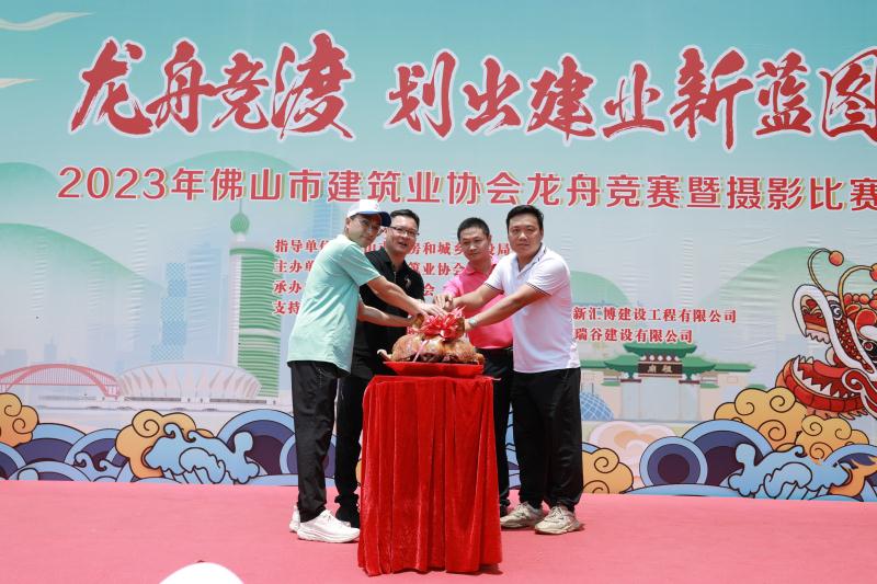 緊接著,廣東雄橋建設(shè)集團(tuán)有限公司副總經(jīng)理余超源、廣東新匯博建設(shè)工程有限公司總經(jīng)理程劍波、廣東恒基隆建設(shè)有限公司總經(jīng)理陳文忠、廣東瑞谷建設(shè)有限公司總經(jīng)理梁堯培一同主持切燒豬儀式。最后,一眾領(lǐng)導(dǎo)及嘉賓移步至河岸,用朱砂為龍頭“點(diǎn)睛”,宣告龍舟賽拉開(kāi)序幕。