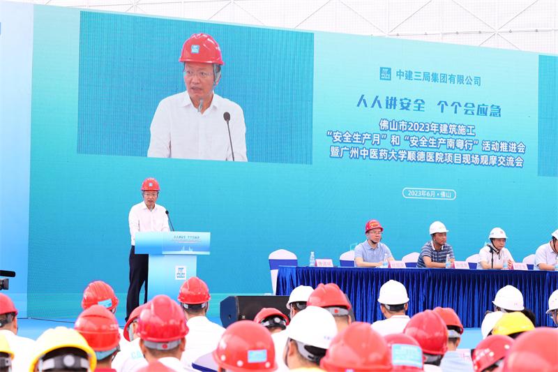 6月15日,佛山市2023年建筑施工“安全生產(chǎn)月”和“安全生產(chǎn)南粵行”活動(dòng)推進(jìn)會暨現(xiàn)場觀摩交流會在中建三局廣州中醫(yī)藥大學(xué)順德醫(yī)院項(xiàng)目舉行。佛山市住房和城鄉(xiāng)建設(shè)局黨組成員、總工程師劉王生,工程質(zhì)量安全監(jiān)管二科科長譚樹治,順德區(qū)住房城鄉(xiāng)建設(shè)和水利局一級主任科員孫寶貴,順德區(qū)工程建設(shè)中心黨組成員、副主任歐國榮,佛山市建筑業(yè)協(xié)會會長魏瓊升,廣州中醫(yī)藥大學(xué)順德醫(yī)院黨委書記李建國受邀出席,項(xiàng)目的建設(shè)、監(jiān)理、施工單位相關(guān)負(fù)責(zé)人等500余人參加活動(dòng)。