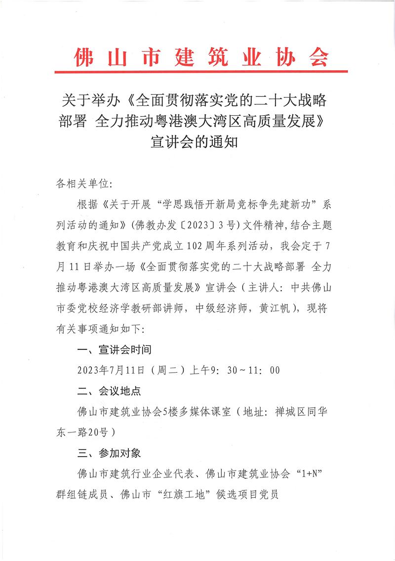 關(guān)于舉辦《全面貫徹落實黨的二十大戰(zhàn)略部署 全力推動粵港澳大灣區(qū)高質(zhì)量發(fā)展》宣講會的通知(2023/07/05)