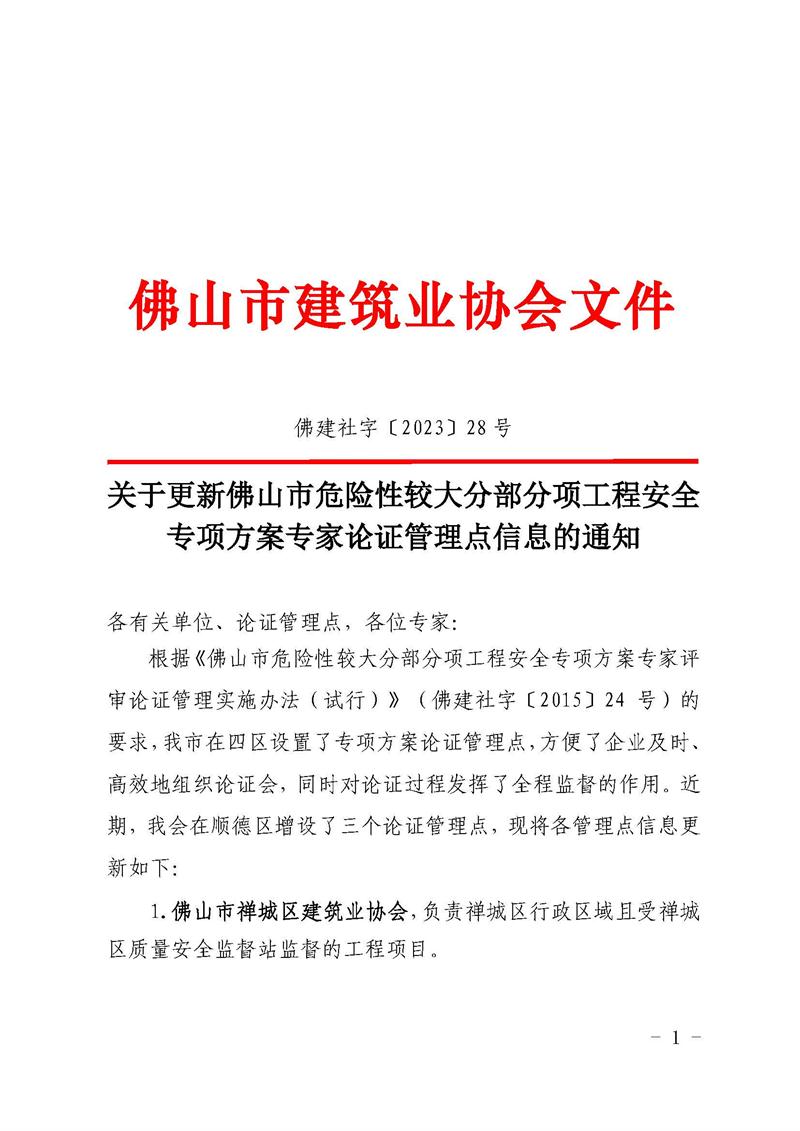 關(guān)于更新佛山市危險性較大分部分項工程安全專項方案專家論證管理點信息的通知(佛建社字〔2023〕28號)