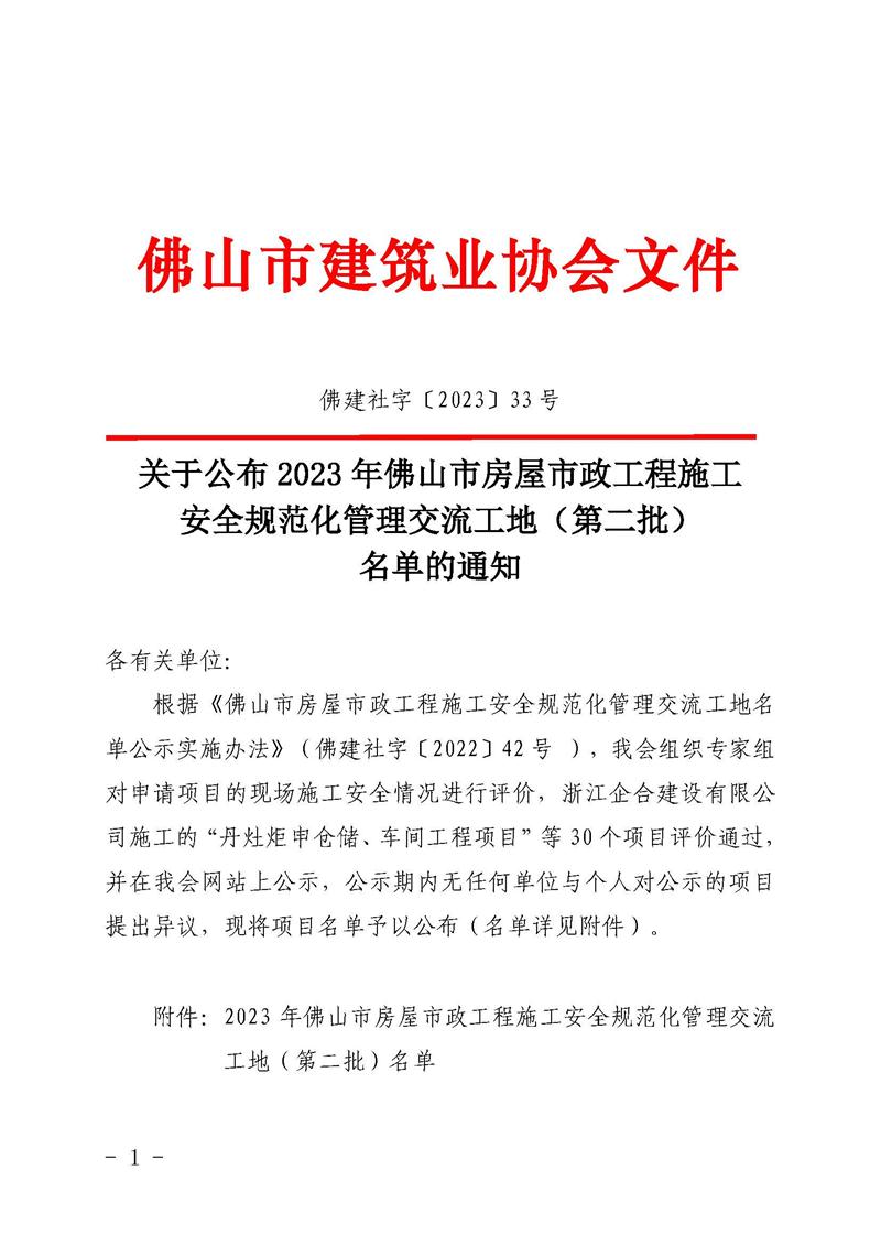 關(guān)于公布2023年佛山市房屋市政工程施工安全規(guī)范化管理交流工地(第二批)名單的通知(佛建社字〔2023〕33號(hào))