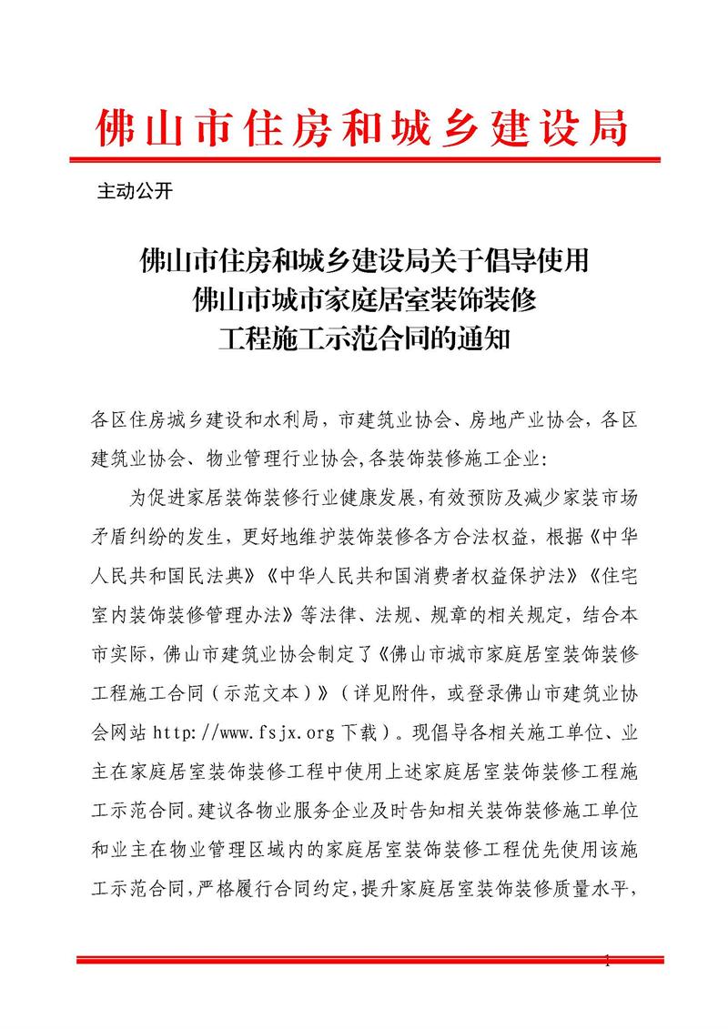 轉(zhuǎn)發(fā)佛山市住房和城鄉(xiāng)建設(shè)局關(guān)于倡導(dǎo)使用佛山市城市家庭居室裝飾裝修工程施工示范合同的通知(2023/12/11)