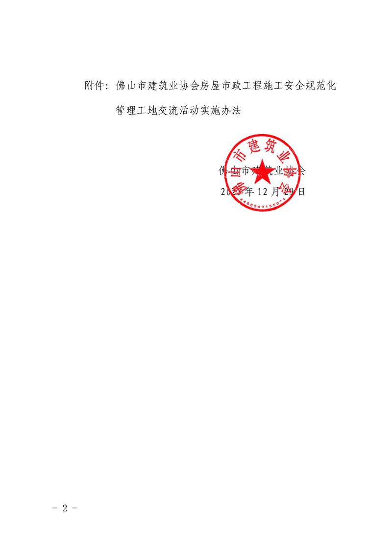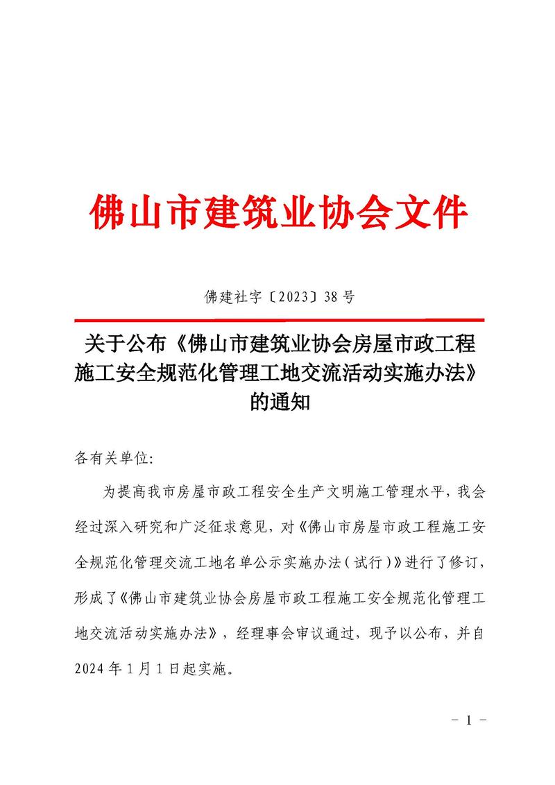 關(guān)于公布《佛山市建筑業(yè)協(xié)會(huì)房屋市政工程施工安全規(guī)范化管理工地交流活動(dòng)實(shí)施辦法》的通知(佛建社字〔2023〕38號(hào))
