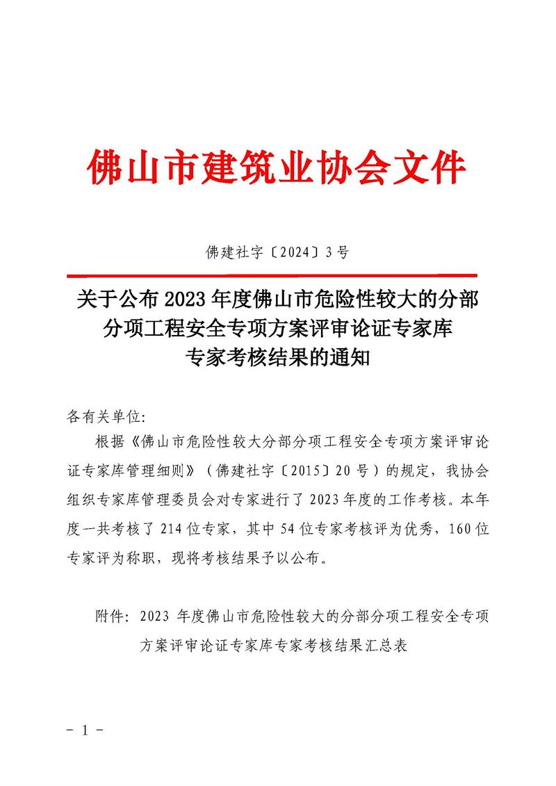 關(guān)于公布2023年度佛山市危險(xiǎn)性較大的分部分項(xiàng)工程安全專項(xiàng)方案評(píng)審論證專家?guī)鞂<铱己私Y(jié)果的通知(佛建社字〔2024〕3號(hào))