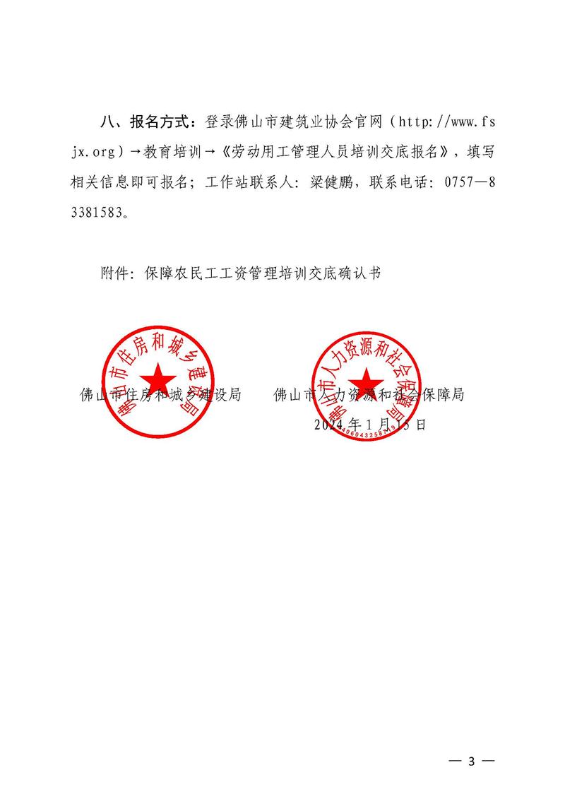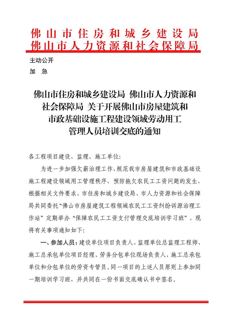 轉(zhuǎn)發(fā)佛山市住房和城鄉(xiāng)建設(shè)局 佛山市人力資源和社會(huì)保障局 關(guān)于開(kāi)展佛山市房屋建筑和市政基礎(chǔ)設(shè)施工程建設(shè)領(lǐng)域勞動(dòng)用工管理人員培訓(xùn)交底的通知(2024/01/26)