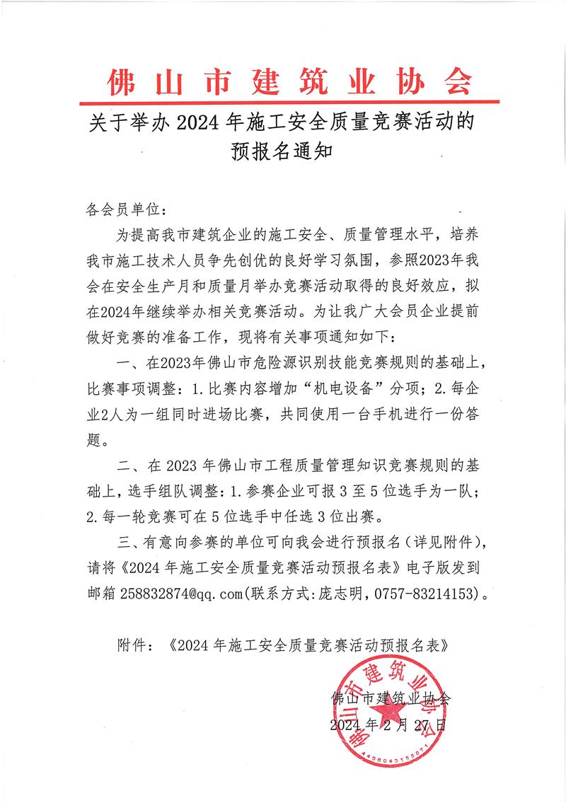 關(guān)于舉辦2024年施工安全質(zhì)量競賽活動的預(yù)報名通知(2024/02/27)