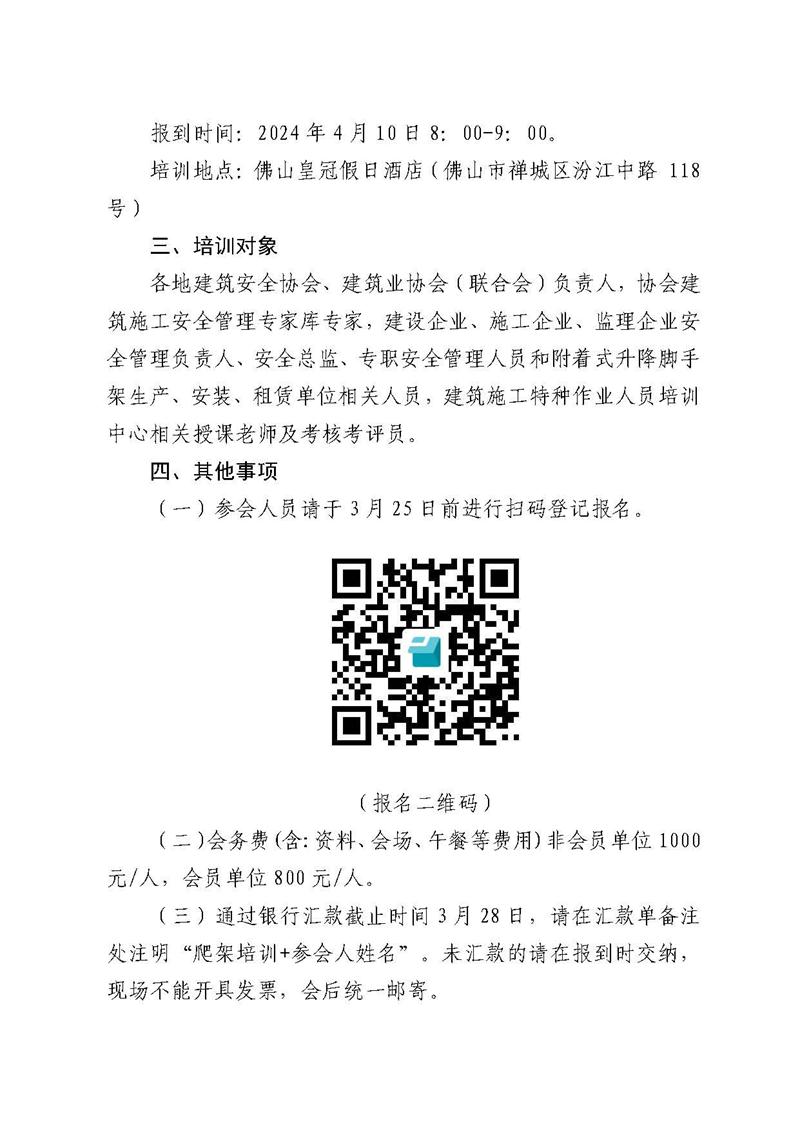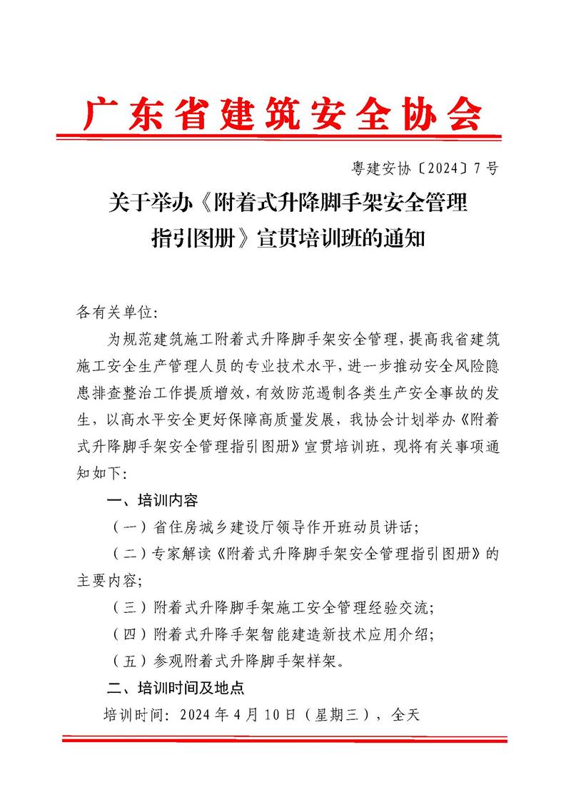 轉(zhuǎn)發(fā)關(guān)于舉辦《附著式升降腳手架安全管理指引圖冊》宣貫培訓(xùn)班的通知(粵建安協(xié)〔2024〕7號)