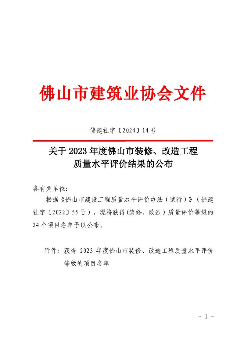 關于2023年度佛山市裝修、改造工程質(zhì)量水平評價結(jié)果的公布(佛建社字〔2024〕14號)