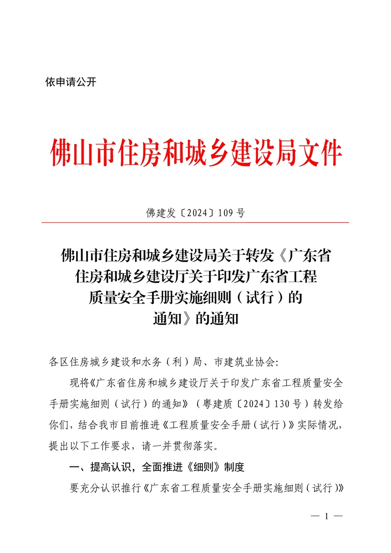 轉(zhuǎn)發(fā)佛山市住房和城鄉(xiāng)建設(shè)局關(guān)于轉(zhuǎn)發(fā)《廣東省住房和城鄉(xiāng)建設(shè)廳關(guān)于印發(fā)廣東省工程質(zhì)量安全手冊實施細(xì)則(試行)的通知》的通知
