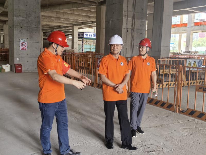 姚毅文秘書長(左)在項目現(xiàn)場向佛山市住房和城鄉(xiāng)建設(shè)局質(zhì)安二科副科長吳奎(中)介紹比賽情況