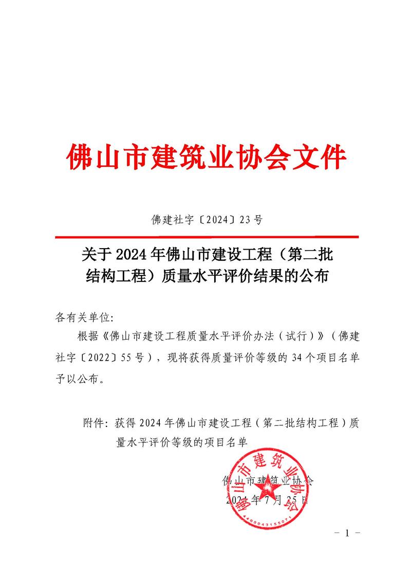 關于2024年佛山市建設工程(第二批結構工程)質量水平評價結果的公布(佛建社字〔2024〕23號)
