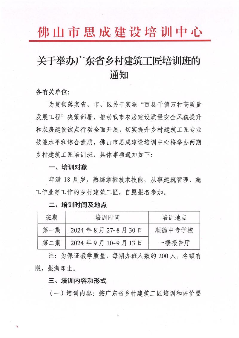 關(guān)于舉辦廣東省鄉(xiāng)村建筑工匠培訓(xùn)班的通知(2024/08/20)