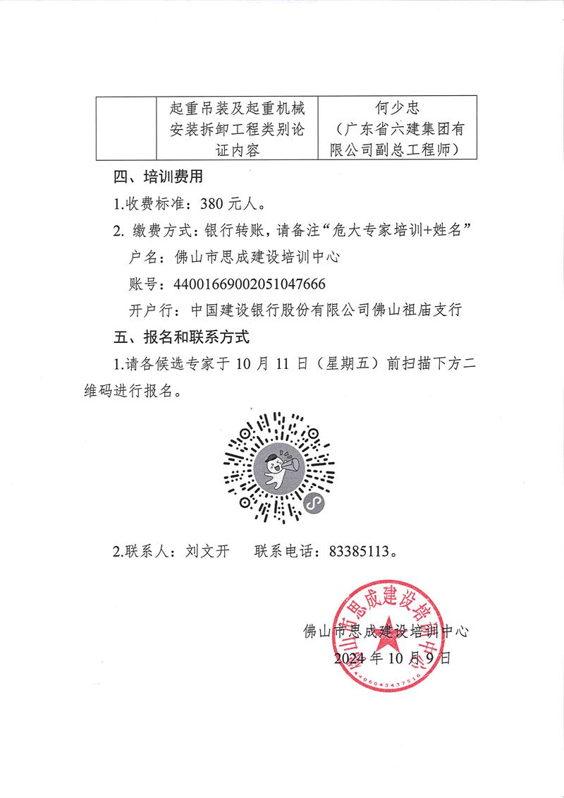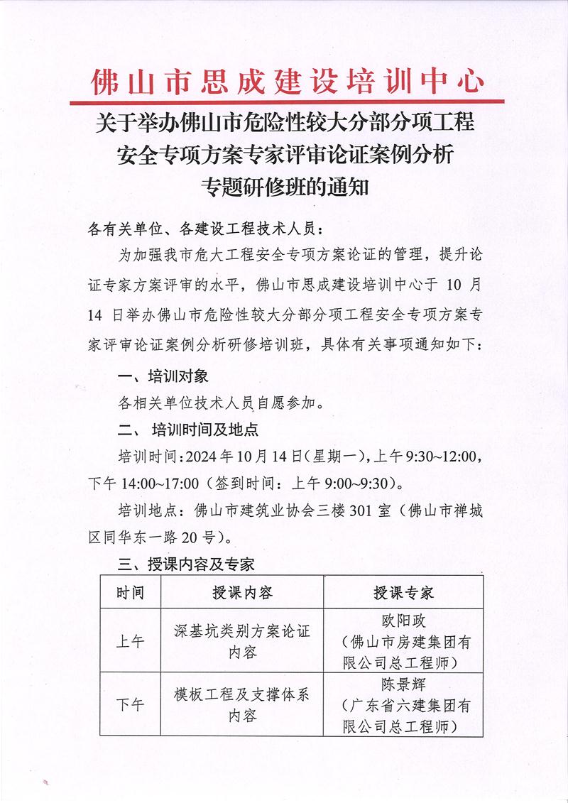 關于舉辦佛山市危險性較大分部分項工程安全專項方案專家評審論證案例分析專題研修班的通知(2024/10/09)