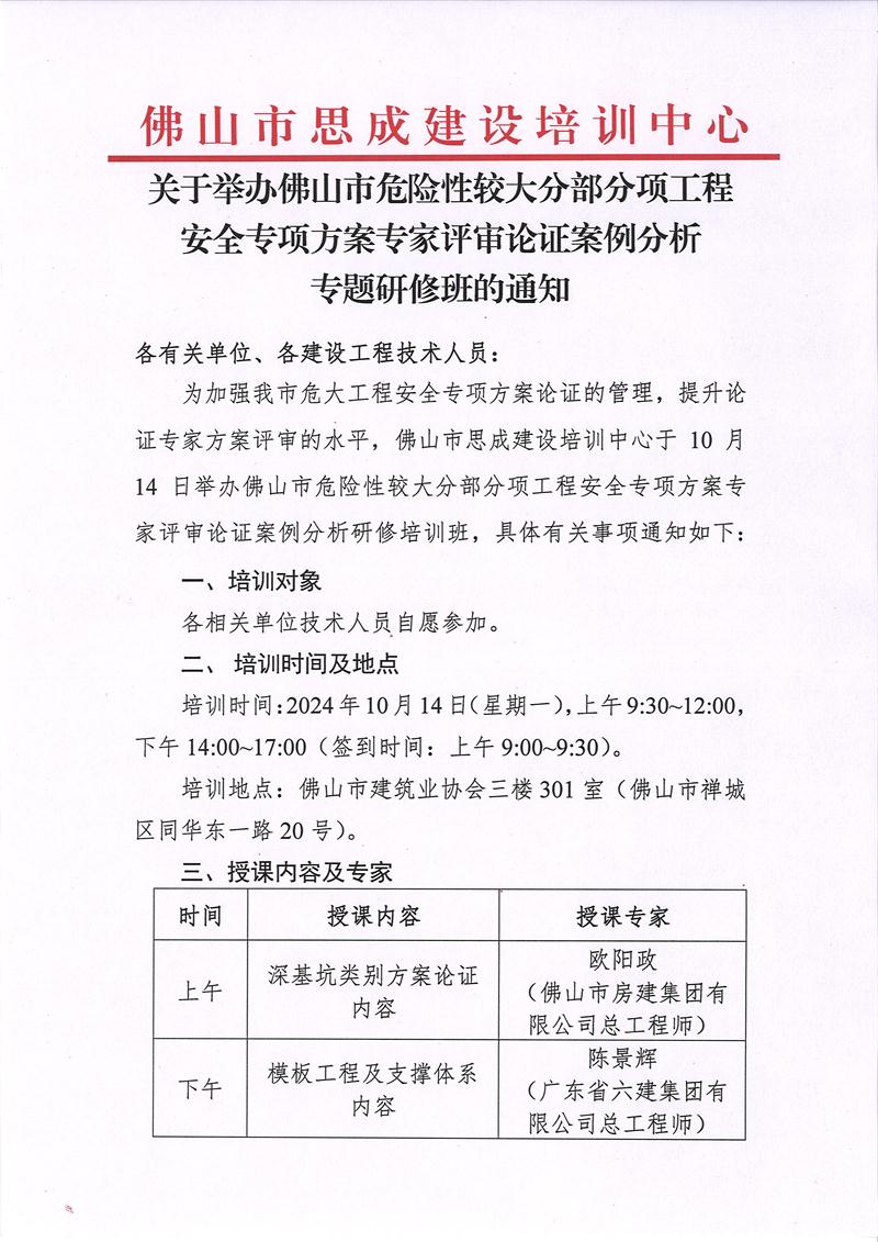 關(guān)于舉辦佛山市危險(xiǎn)性較大分部分項(xiàng)工程安全專項(xiàng)方案專家評(píng)審論證案例分析專題研修班的通知(2024/10/09)