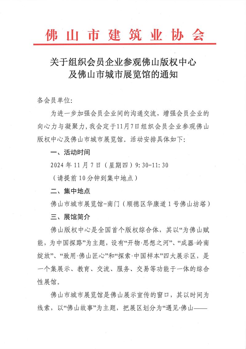 關(guān)于組織會(huì)員企業(yè)參觀佛山版權(quán)中心及佛山市城市展覽館的通知(2024/10/28)