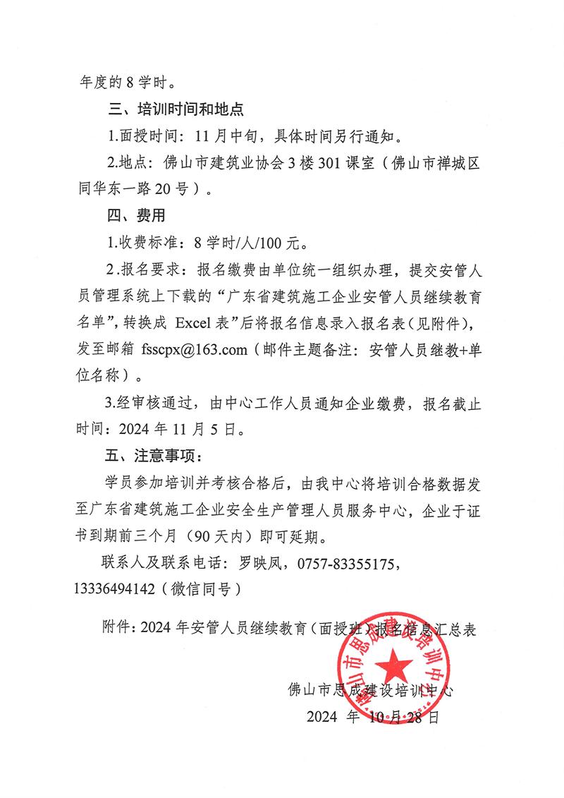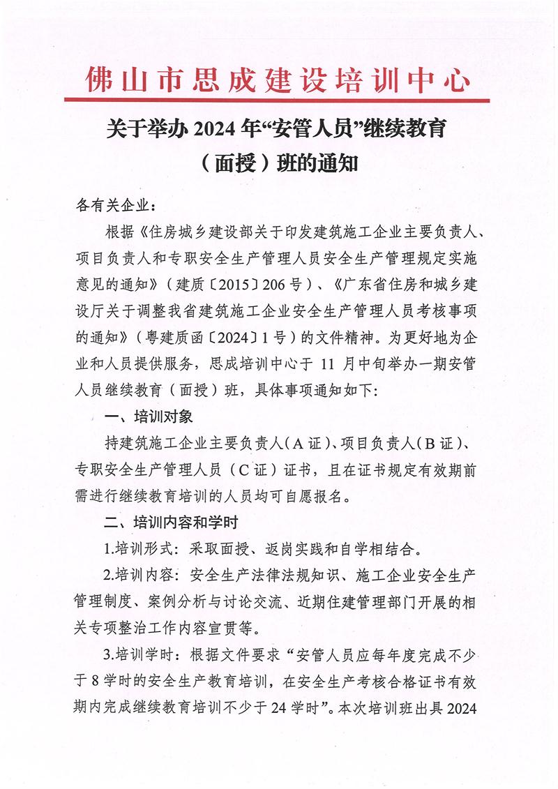 關(guān)于舉辦2024年“安管人員”繼續(xù)教育(面授)班的通知(2024/10/28)