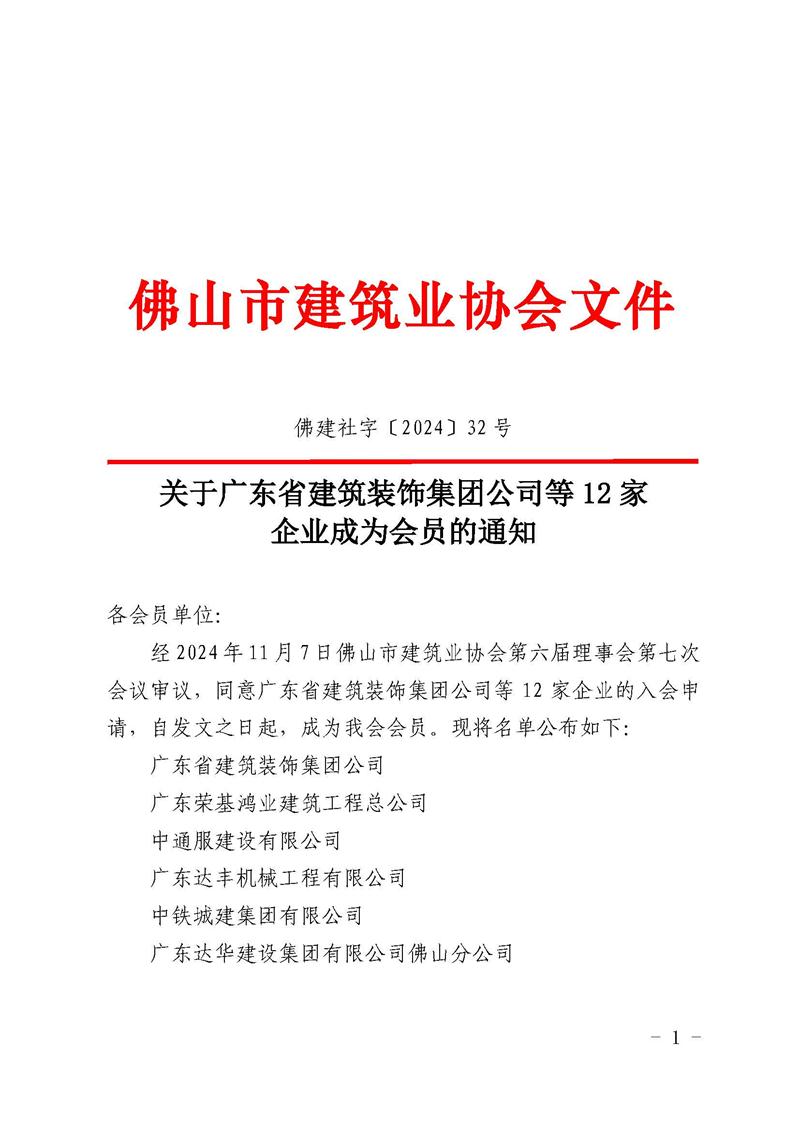 關于廣東省建筑裝飾集團公司等12家企業(yè)成為會員的通知(佛建社字〔2024〕32號)