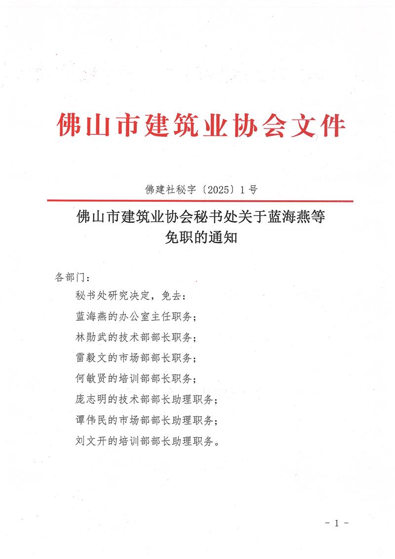 佛山市建筑業(yè)協(xié)會(huì)秘書(shū)處關(guān)于藍(lán)海燕等免職的通知(佛建社秘字〔2025〕1號(hào))