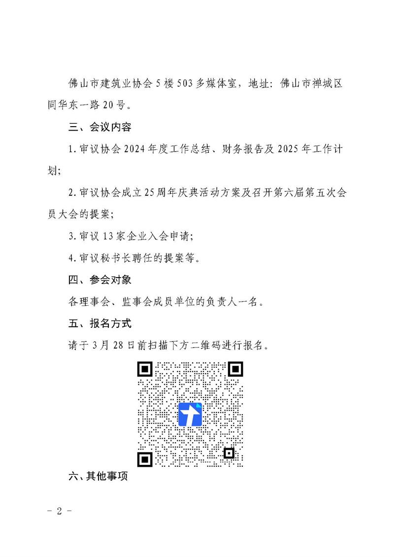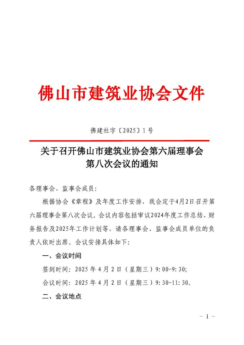 關(guān)于召開佛山市建筑業(yè)協(xié)會(huì)第六屆理事會(huì)第八次會(huì)議的通知(佛建社字〔2025〕1號)