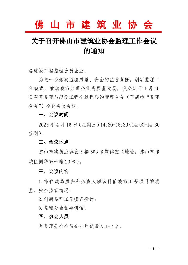 關(guān)于召開佛山市建筑業(yè)協(xié)會(huì)監(jiān)理工作會(huì)議的通知(2025/04/09)