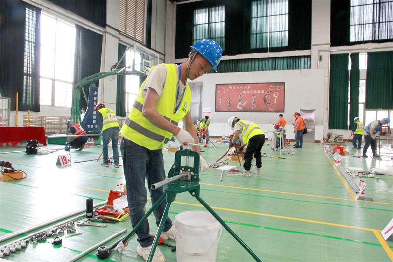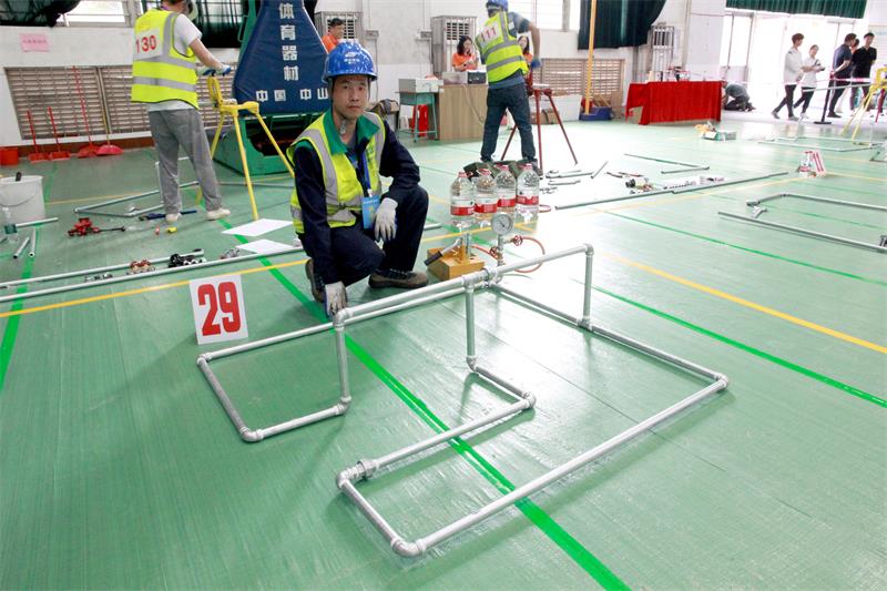 本次競賽的實操考核要求選手在3小時內(nèi),使用承辦方提供的鍍鋅鋼管、彎頭等材料,按施工圖紙完成比賽作品。上午9:10,隨著裁判發(fā)出比賽開始的命令,現(xiàn)場隨即響起工具與材料碰撞的清脆聲音,選手們按照自己的節(jié)奏有條不紊地“開干”。
