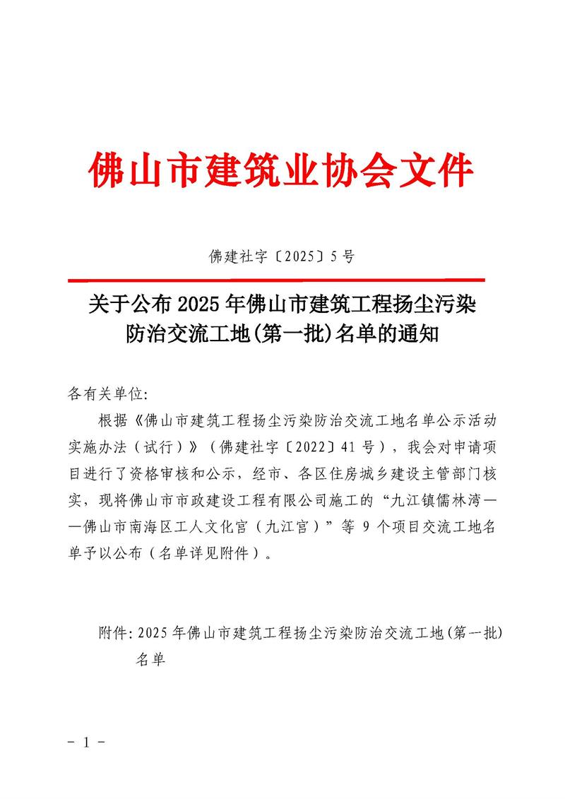 關(guān)于公布2025年佛山市建筑工程揚(yáng)塵污染防治交流工地(第一批)名單的通知(佛建社字〔2025〕5號(hào))