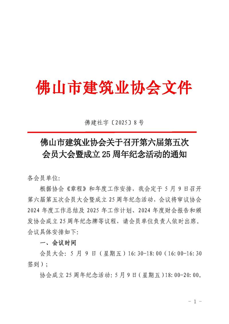 佛山市建筑業(yè)協(xié)會關于召開第六屆第五次會員大會暨成立25周年紀念活動的通知(佛建社字〔2025〕8號)