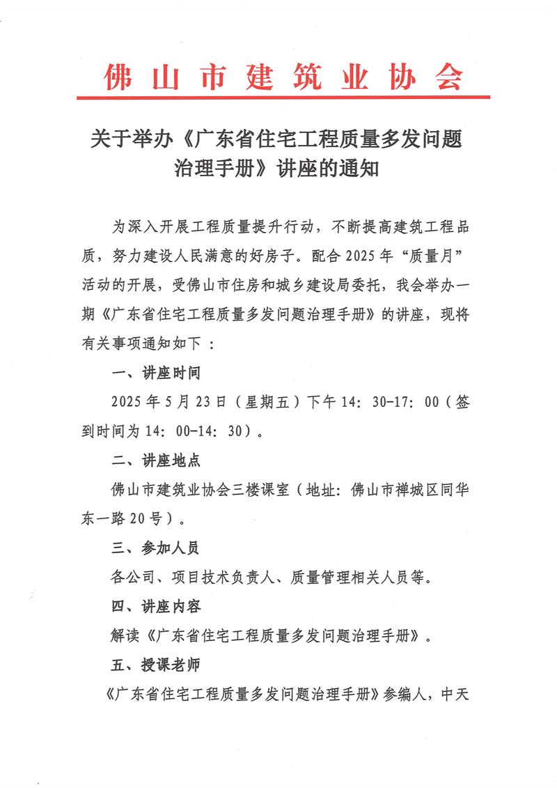 關(guān)于舉辦《廣東省住宅工程質(zhì)量多發(fā)問題治理手冊》講座的通知(2025/05/19)