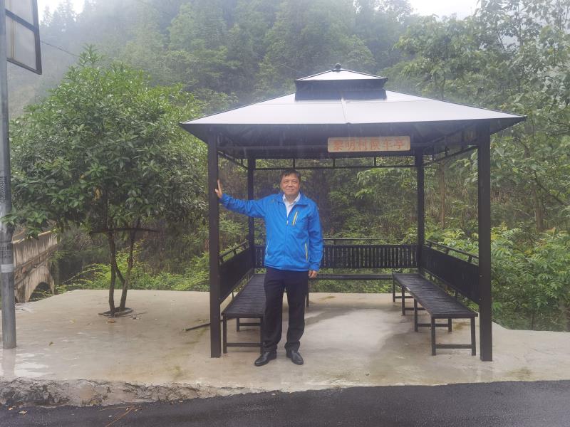 姚毅文在我會結(jié)對幫扶的黎明村所援助建設完成的公交候車亭前拍照