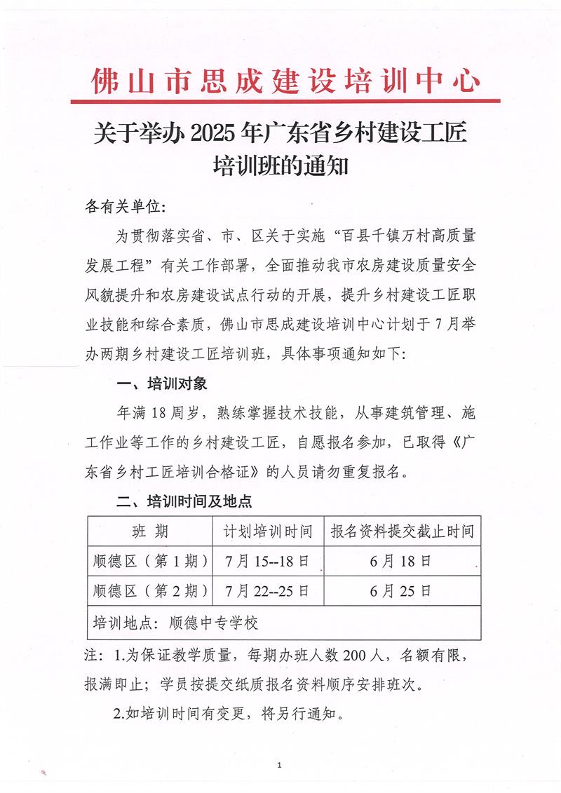 關(guān)于舉辦2025年廣東省鄉(xiāng)村建設(shè)工匠培訓(xùn)班的通知(2025/05/22)