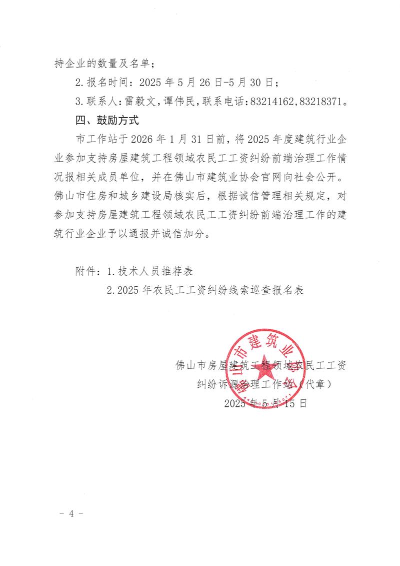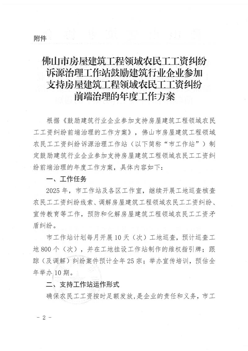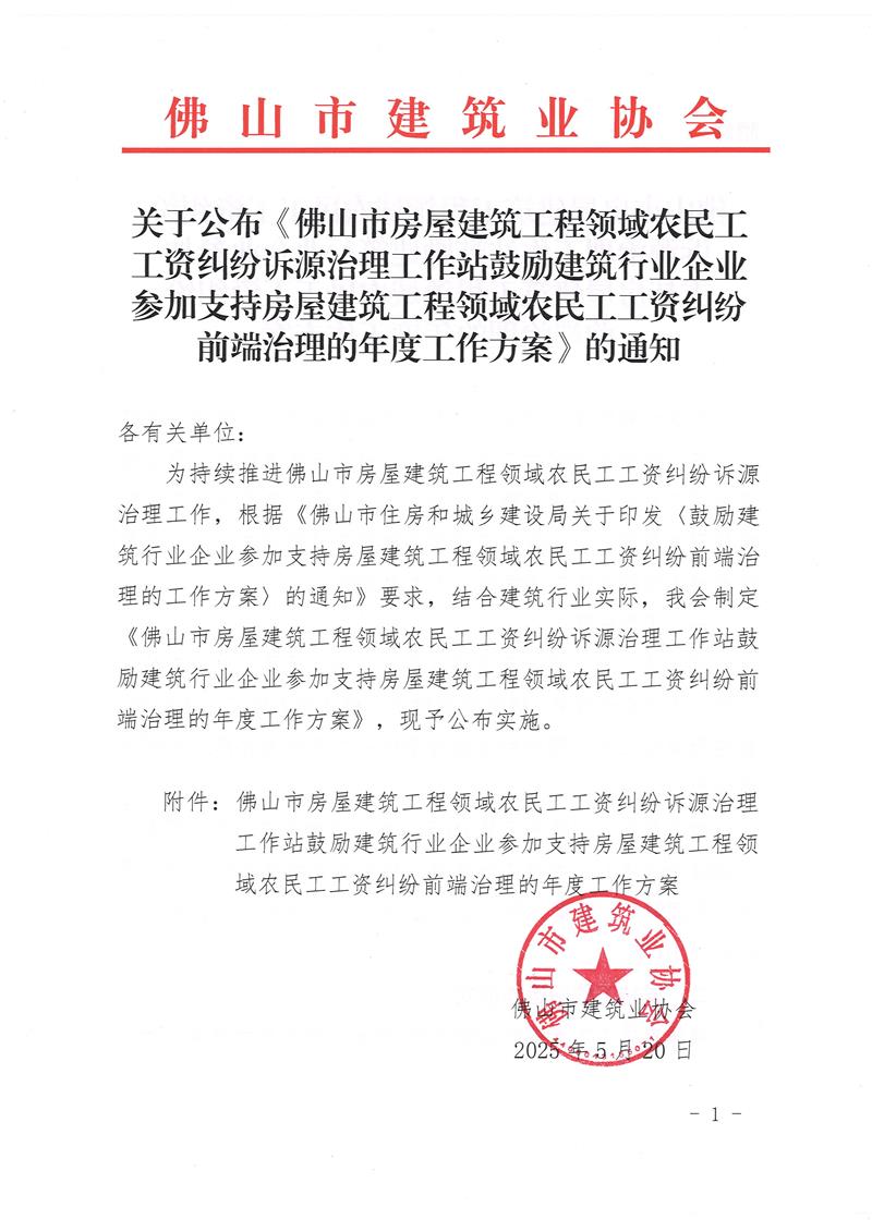 關(guān)于公布《佛山市房屋建筑工程領(lǐng)域農(nóng)民工工資糾紛訴源治理工作站鼓勵建筑行業(yè)企業(yè)參加支持房屋建筑工程領(lǐng)域農(nóng)民工工資糾紛前端治理的年度工作方案》的通知(2025/05/23)