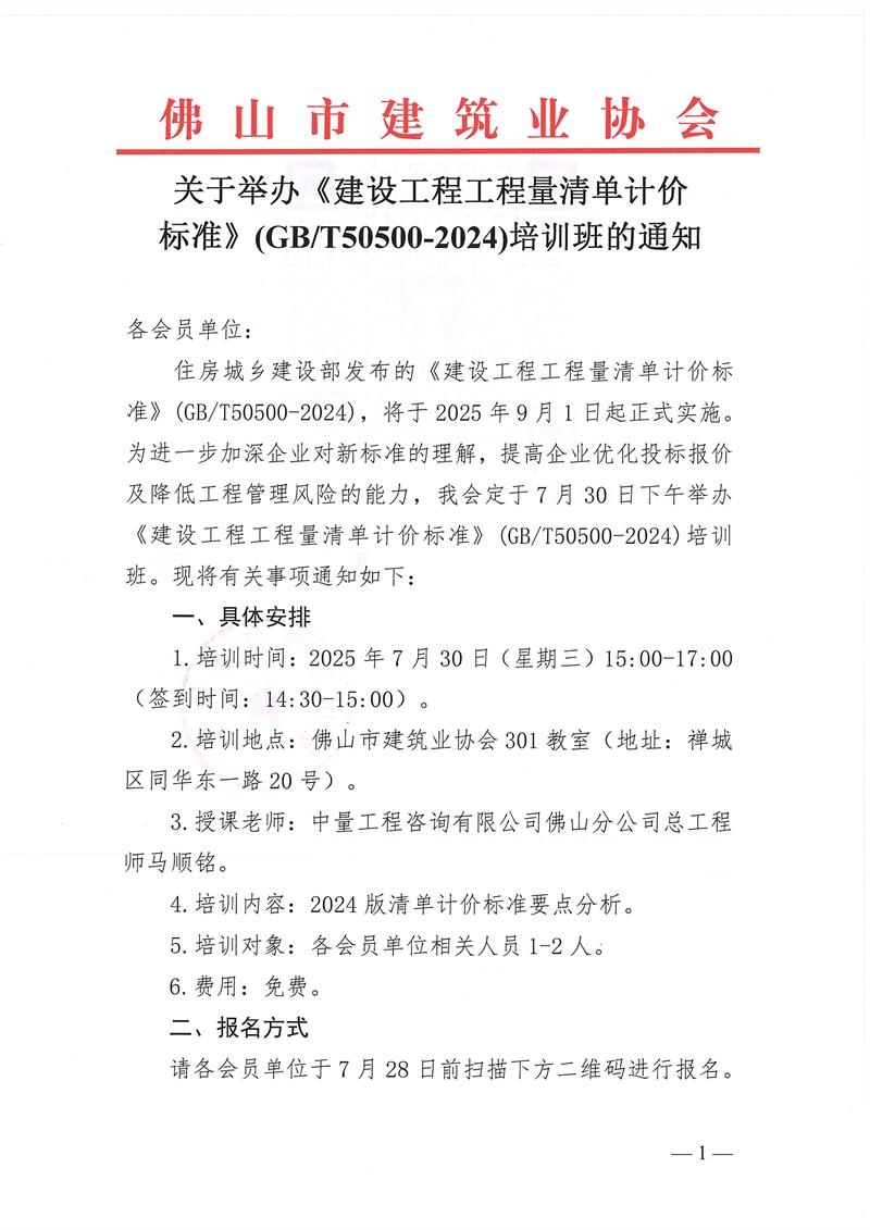 關于舉辦《建設工程工程量清單計價標準》(GB∕T50500-2024)培訓班的通知(2025/07/21)