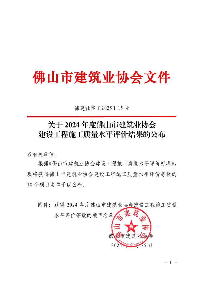關(guān)于2024年度佛山市建筑業(yè)協(xié)會(huì)建設(shè)工程施工質(zhì)量水平評(píng)價(jià)結(jié)果的公布(佛建社字〔2025〕15號(hào))