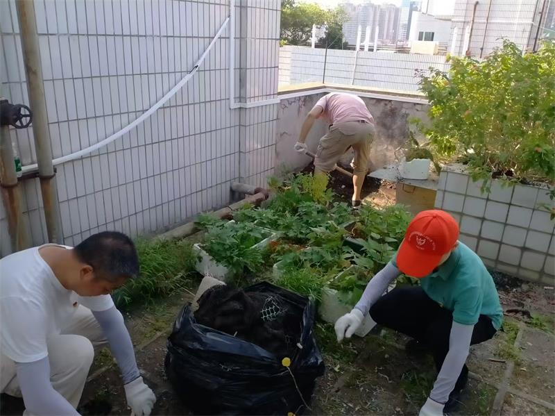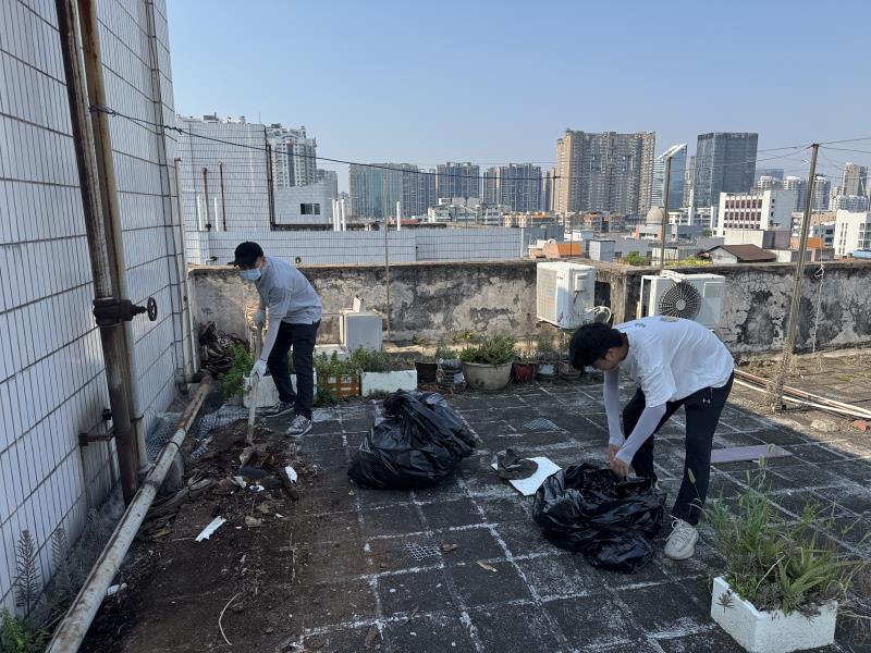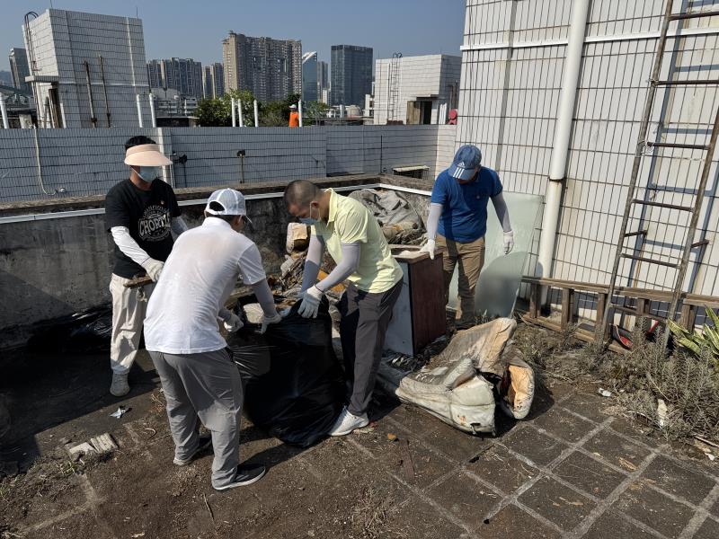 在我會(huì)黨支部書記雷毅文(右一)的帶領(lǐng)下大家動(dòng)手清理頂樓的雜物