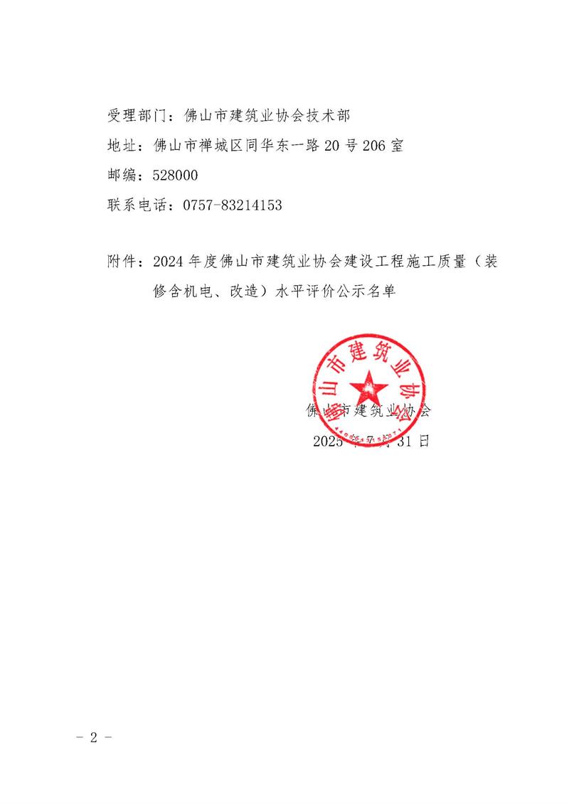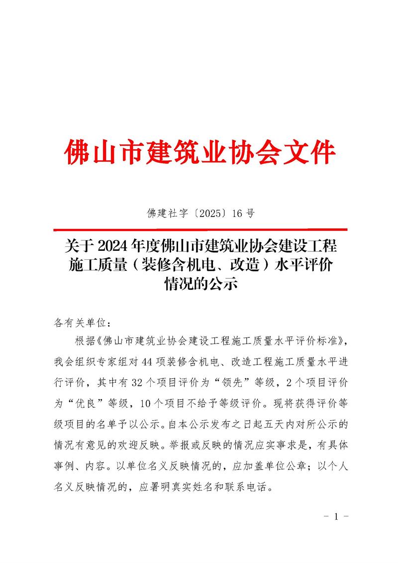 關(guān)于2024年度佛山市建筑業(yè)協(xié)會(huì)建設(shè)工程施工質(zhì)量(裝修含機(jī)電、改造)水平評(píng)價(jià)情況的公示(佛建社字〔2025〕16號(hào))