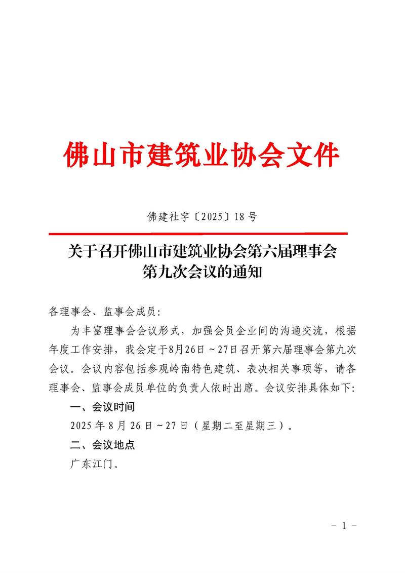 關(guān)于召開佛山市建筑業(yè)協(xié)會(huì)第六屆理事會(huì)第九次會(huì)議的通知(佛建社字〔2025〕18號(hào))