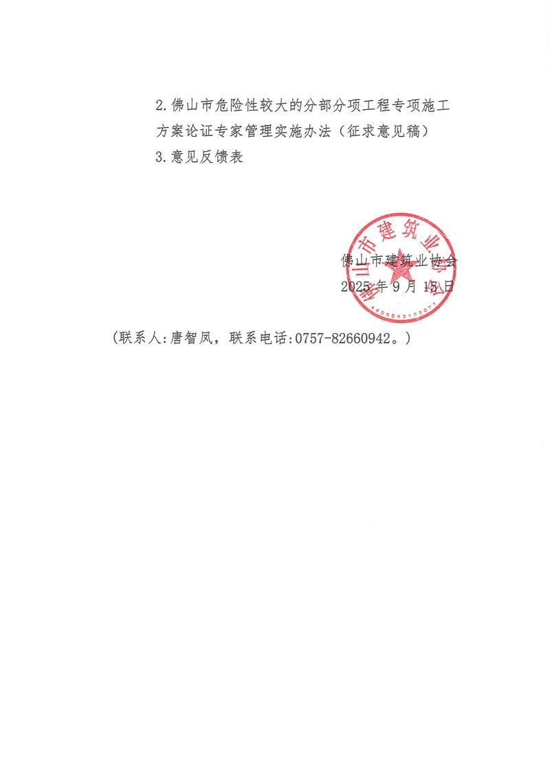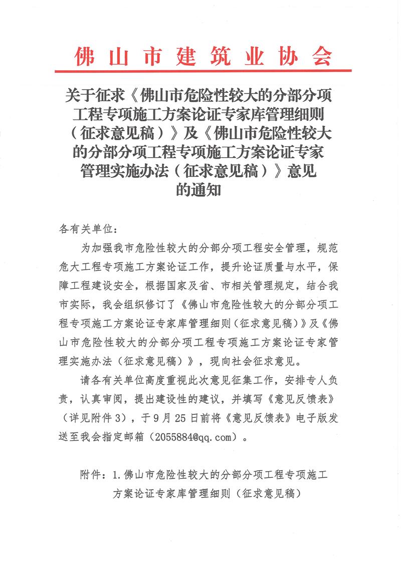 關(guān)于征求《佛山市危險(xiǎn)性較大的分部分項(xiàng)工程專項(xiàng)施工方案論證專家?guī)旃芾砑?xì)則》及《佛山市危險(xiǎn)性較大的分部分項(xiàng)工程專項(xiàng)施工方案論證專家管理實(shí)施辦法》意見(jiàn)的通知(2025/09/15)