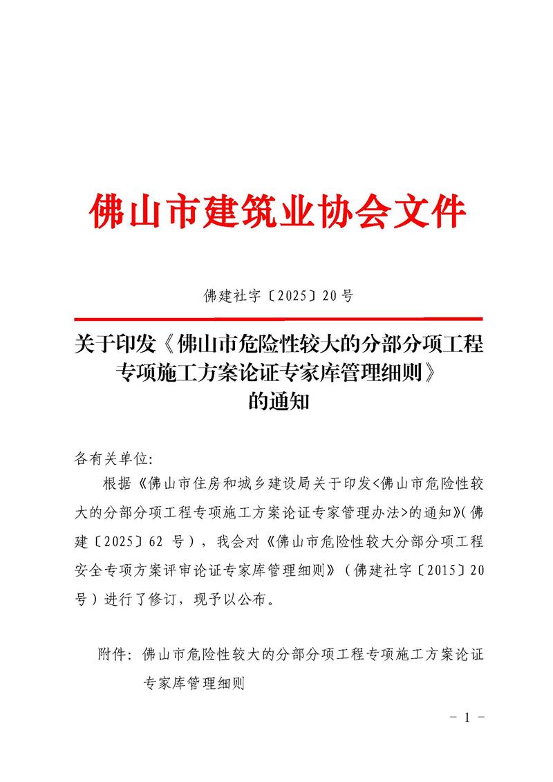 關(guān)于印發(fā)《佛山市危險性較大的分部分項工程專項施工方案論證專家?guī)旃芾砑殑t》的通知(佛建社字〔2025〕20號)