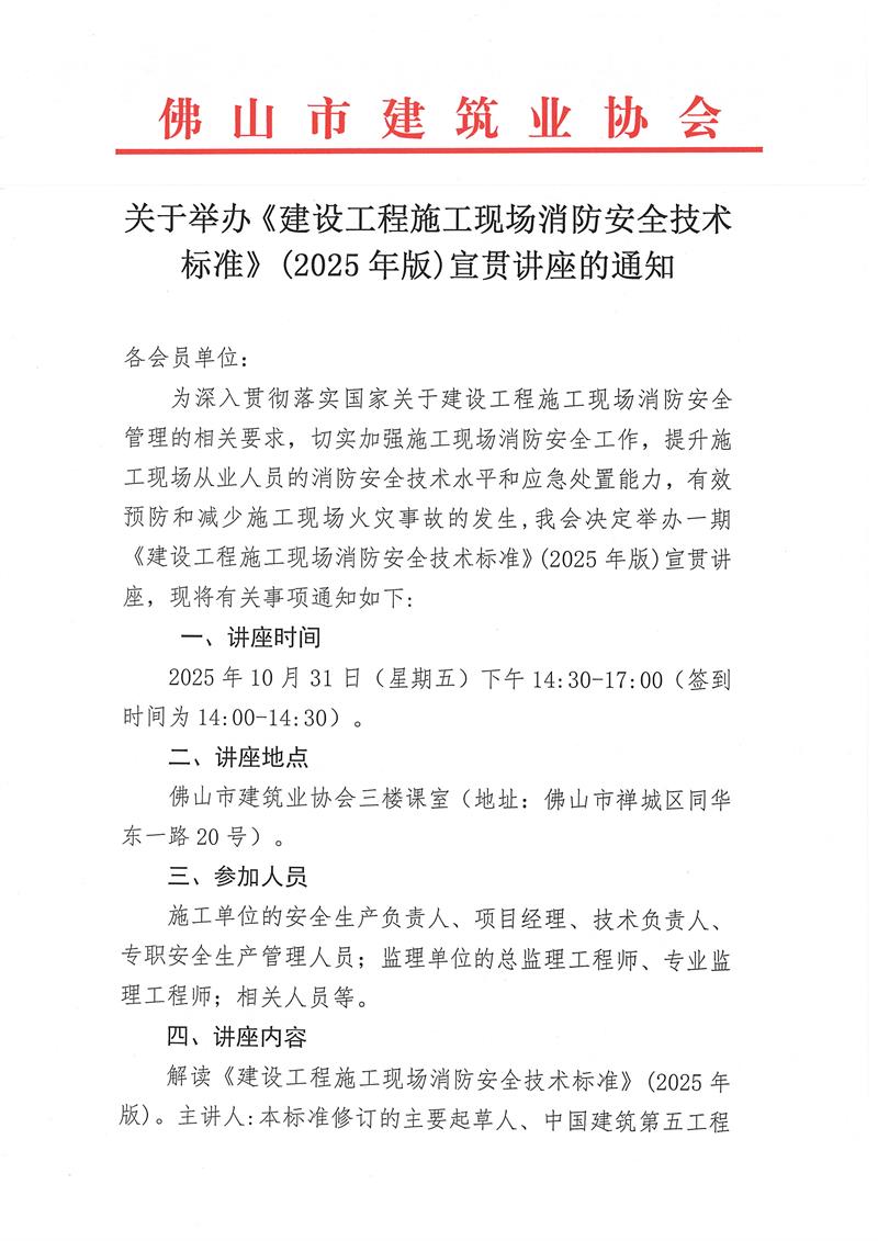 關(guān)于舉辦《建設(shè)工程施工現(xiàn)場(chǎng)消防安全技術(shù)標(biāo)準(zhǔn)》(2025年版)宣貫講座的通知(2025/10/20)