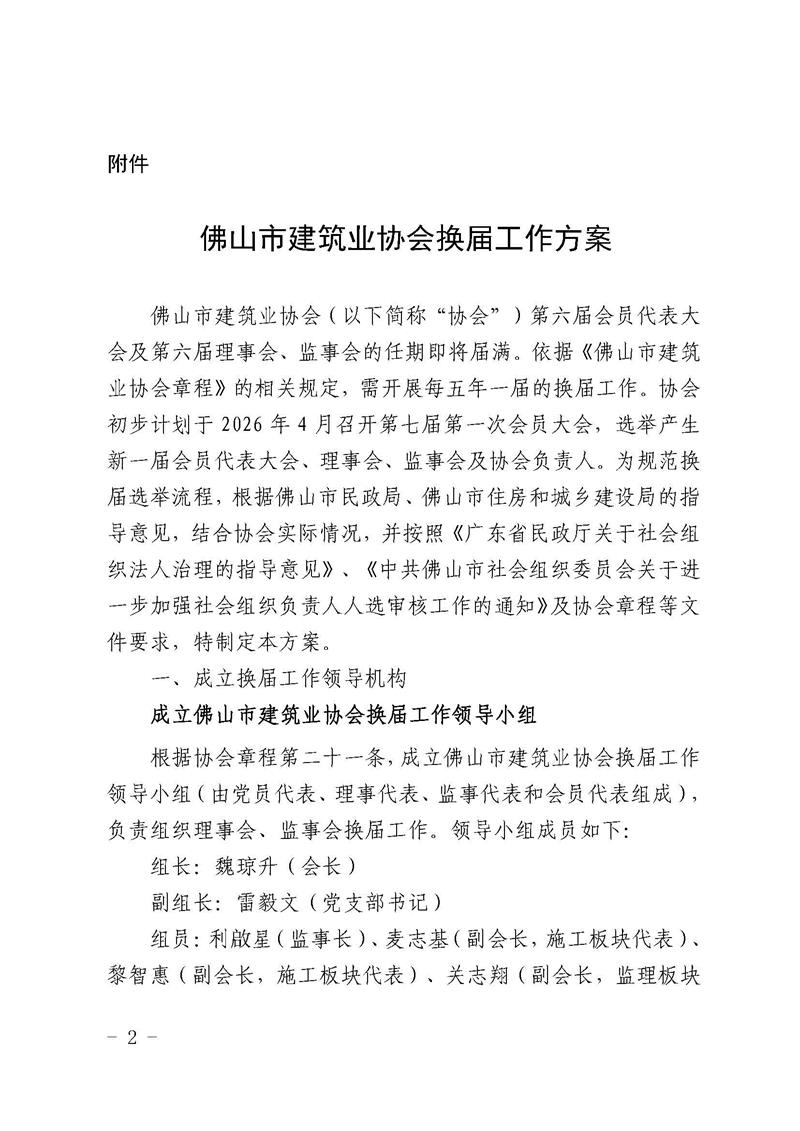 關(guān)于公布佛山市建筑業(yè)協(xié)會換屆工作方案的通知(佛建社字〔2025〕25號)