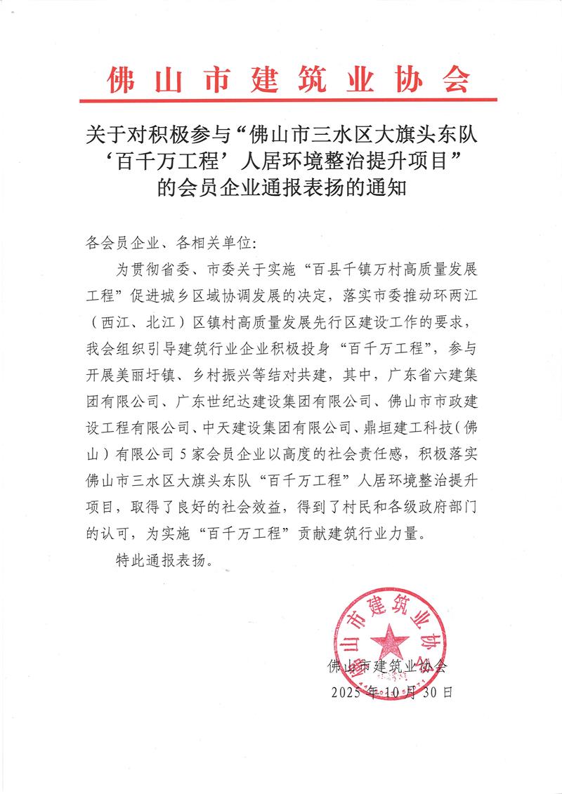 關(guān)于對(duì)積極參與“佛山市三水區(qū)大旗頭東隊(duì)‘百千萬(wàn)工程’人居環(huán)境整治提升項(xiàng)目”的會(huì)員企業(yè)通報(bào)表?yè)P(yáng)的通知(2025/10/30)