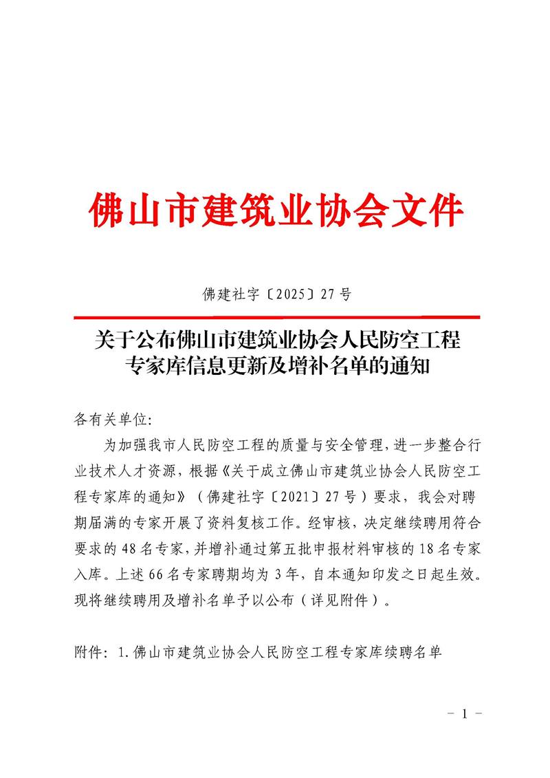 關(guān)于公布佛山市建筑業(yè)協(xié)會(huì)人民防空工程專家?guī)煨畔⒏录霸鲅a(bǔ)名單的通知(佛建社字〔2025〕27號(hào))